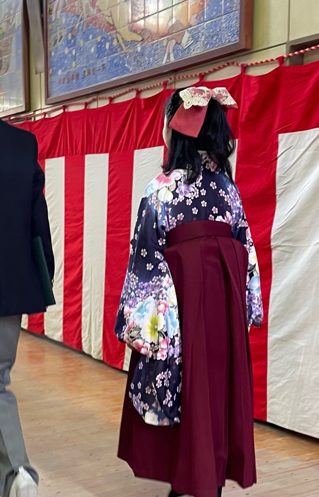 卒業式は、お姉ちゃんのおさがりの袴。髪飾りは、手作りのリボンで。